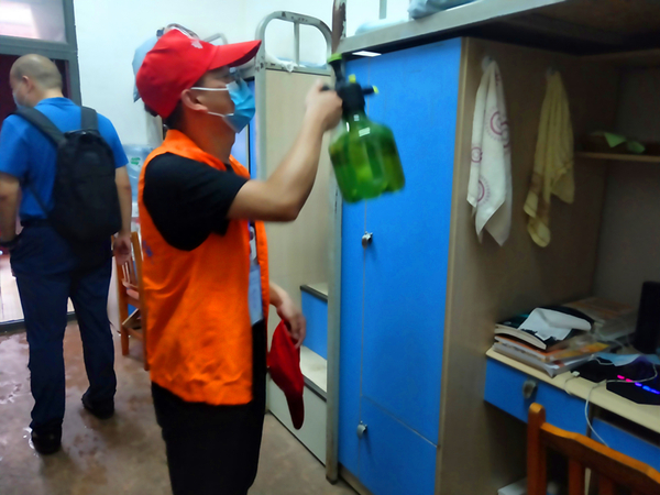 当天晚上,学院党委书记胡伟带领学生志愿者团队走进2019级学生寝室开展首次活动,从过道、地面、厕所到同学们日常接触的门把手、桌椅、床位都进行了全面的消毒。胡伟还亲切的与同学们攀谈,为同学们讲解疫情防护知识,了解同学们的日常学习生活情况。鼓励大家在疫情防控特殊时期更要努力学习、养成良好的学习生活习惯,严格遵守学校各项纪律,圆满完成本学期的学习任务。