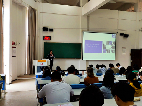 本次团课,李书就现在存在的“学生官僚主义”现象,分三部分给同学们讲述了作为大学生应该怎样做。第一部分举了例子讲述了什么是“学生官”的现象,第二部分举了“学生干部叫抄名字”的例子分析了“学生官”产生的原因,第三部分告诉了同学们怎样消除“官本位”的错误思想。最后告诫同学们要树立正确的人生观、世界观、价值观,并作为学生干部同学们要正确认识“学生官”现象的危害,坚决对此类现象说“不”,但也要积极竞选学生干部锻炼自己,为班级、学院做自己力所能及的事,提高自己的道德品质。