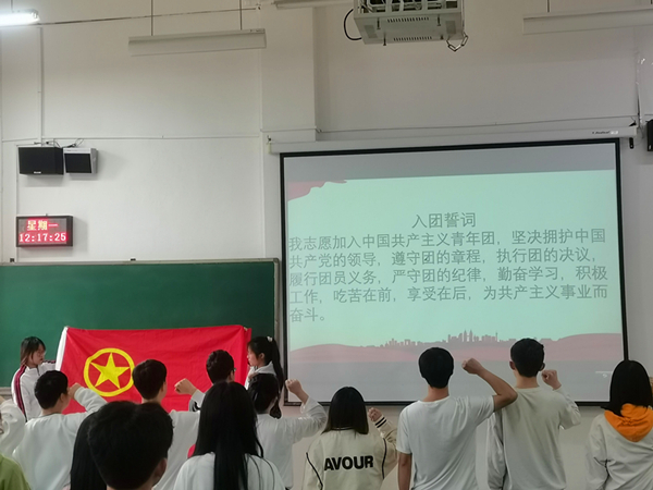新团员入团仪式在《国歌》中拉开序幕,在李书的领誓下,17名新团员们举起右手在团旗下庄严宣誓,表达了团员们对共青团组织的无限向往和为团组织增光添彩的豪迈激情。随后,李书对新团员提出希望与要求:“希望新团员珍惜青春年华、勤奋学习,树立远大理想、勇攀高峰,充分发挥共青团员模范带头作用。”