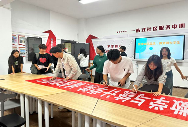 6月12日,老虎机游戏在线玩 在“一站式”社区服务中心召开诚信教育座谈会暨“诚信校园行”学生签名仪式,学院党委副书记李书、辅导员蔡丽莉、学院资助小组全体成员、各年级学生代表参加。