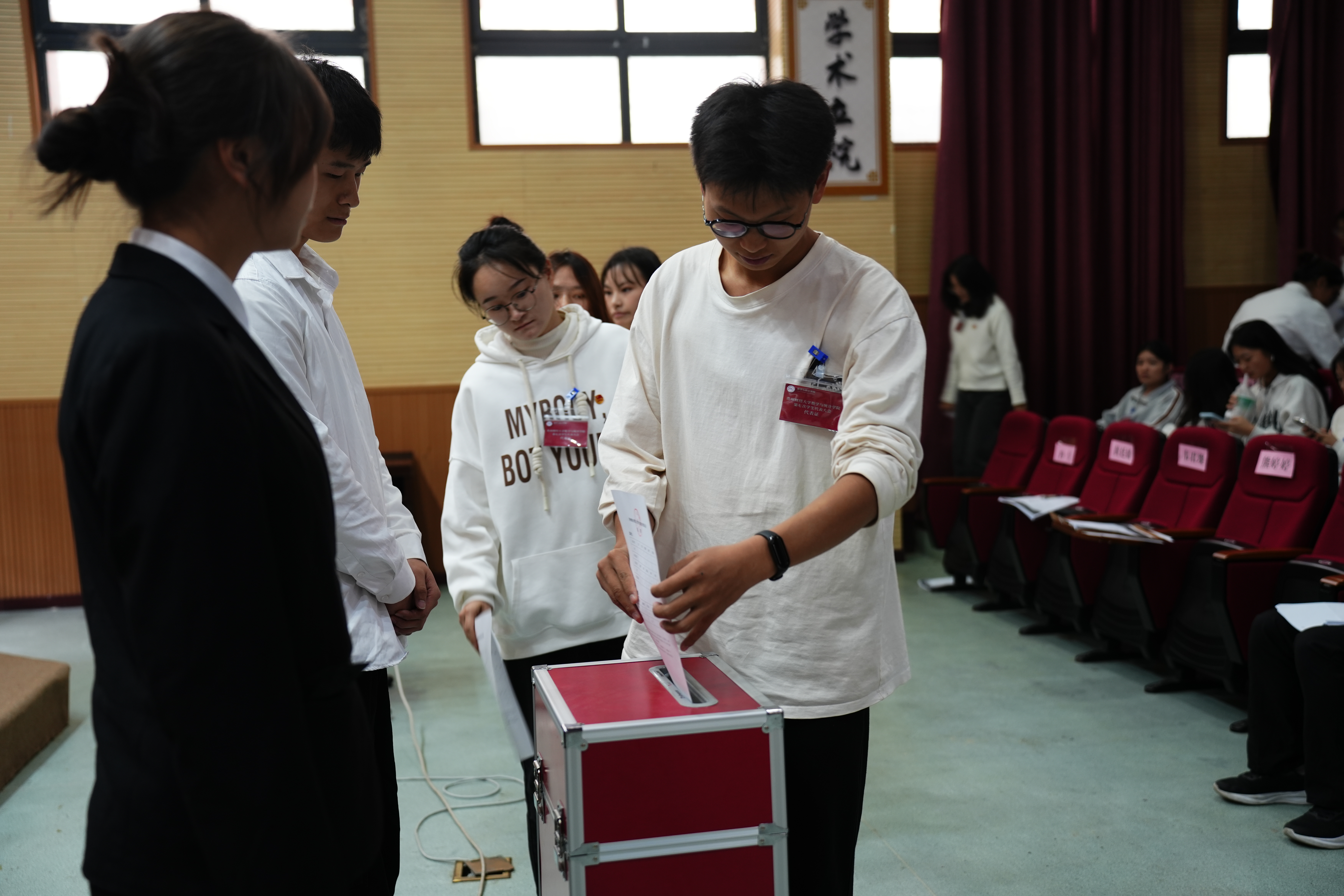 2024年11月8日,老虎机游戏在线玩 第七次学生代表大会在崇德楼报告厅顺利举行。出席本次大会的有老虎机游戏在线玩 学院党委副书记李书、党委副处级专职组织员余纯、校团委组织部部长赵红亮、院团委书记贺婧及来自各班级的学生代表。