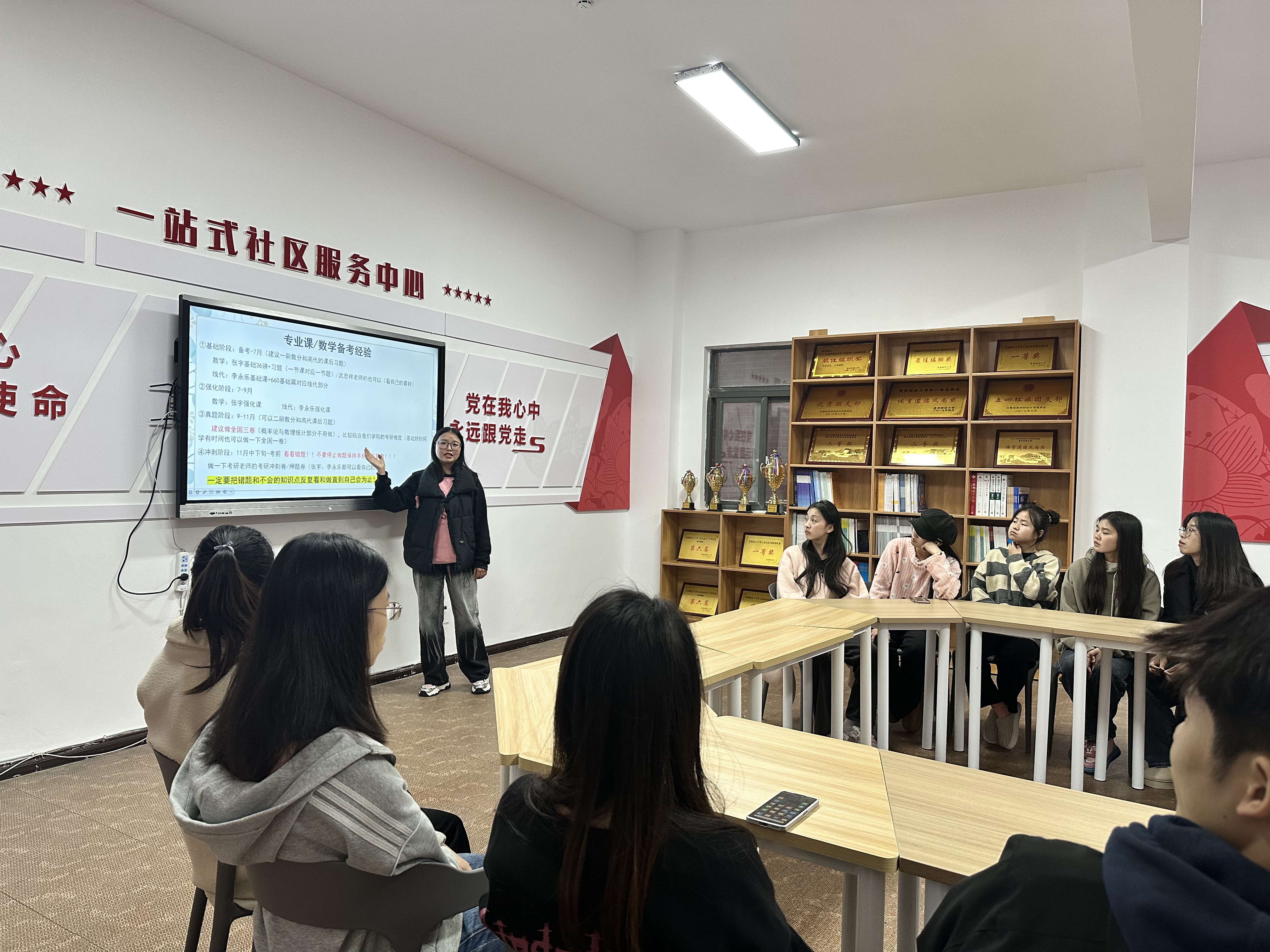 2024年11月18日,老虎机游戏在线玩 在“一站式”学生社区服务中心开展学习成效及经验分享活动,邀请了2024级研究生祝元巧、2022级本科生赵泽航为同学们分享参加考研和参加学科竞赛的经验,老虎机游戏在线玩 学生积极参加,活动由学院学生工作科科长蔡丽莉主持。
