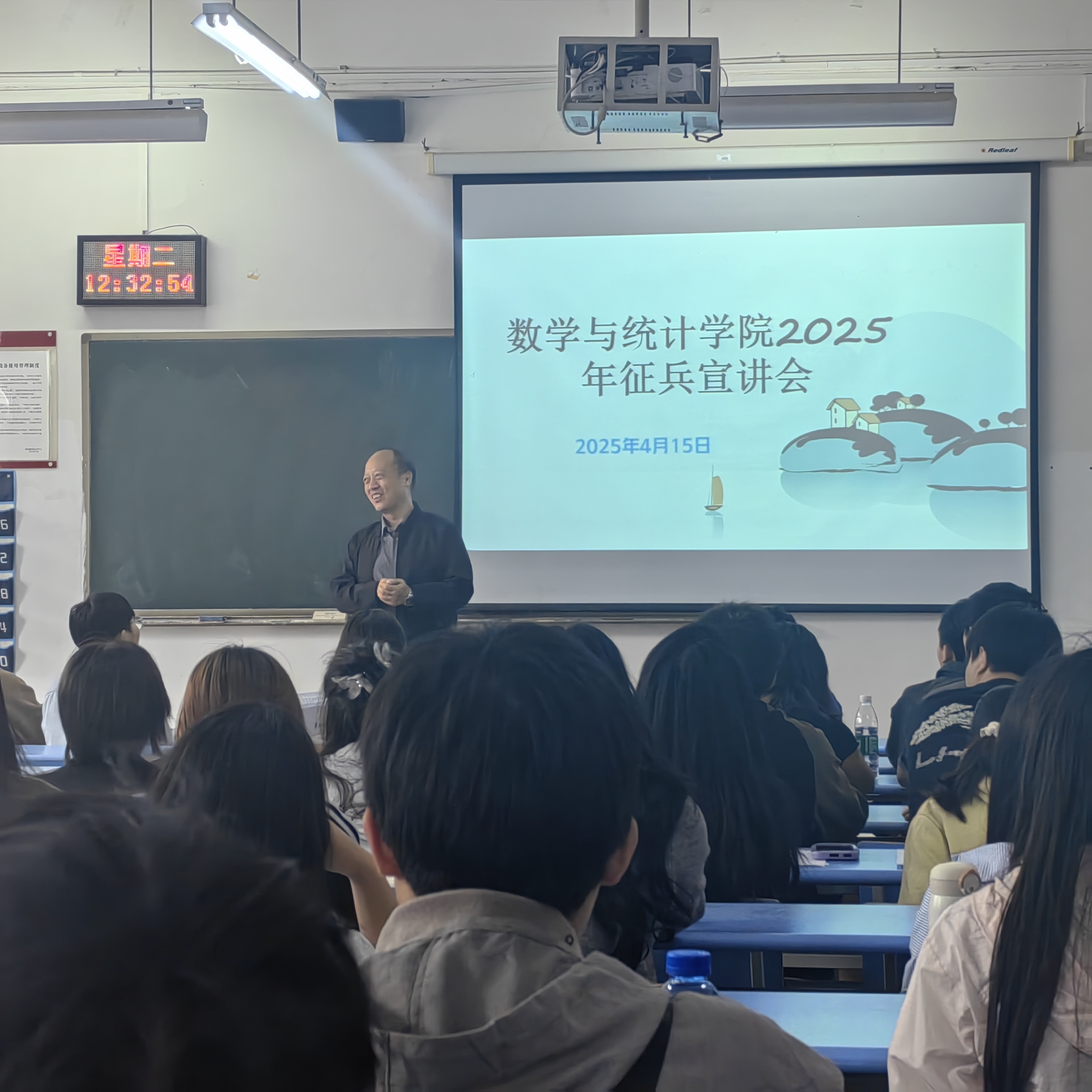 4月15日,老虎机游戏在线玩 在勤学楼举办2025年征兵宣讲会。学校武装部国防教育科老师胡细根应邀宣讲,“数”职未来班主任工作室负责人舒瑜主持,学院2025届全体毕业生参加。