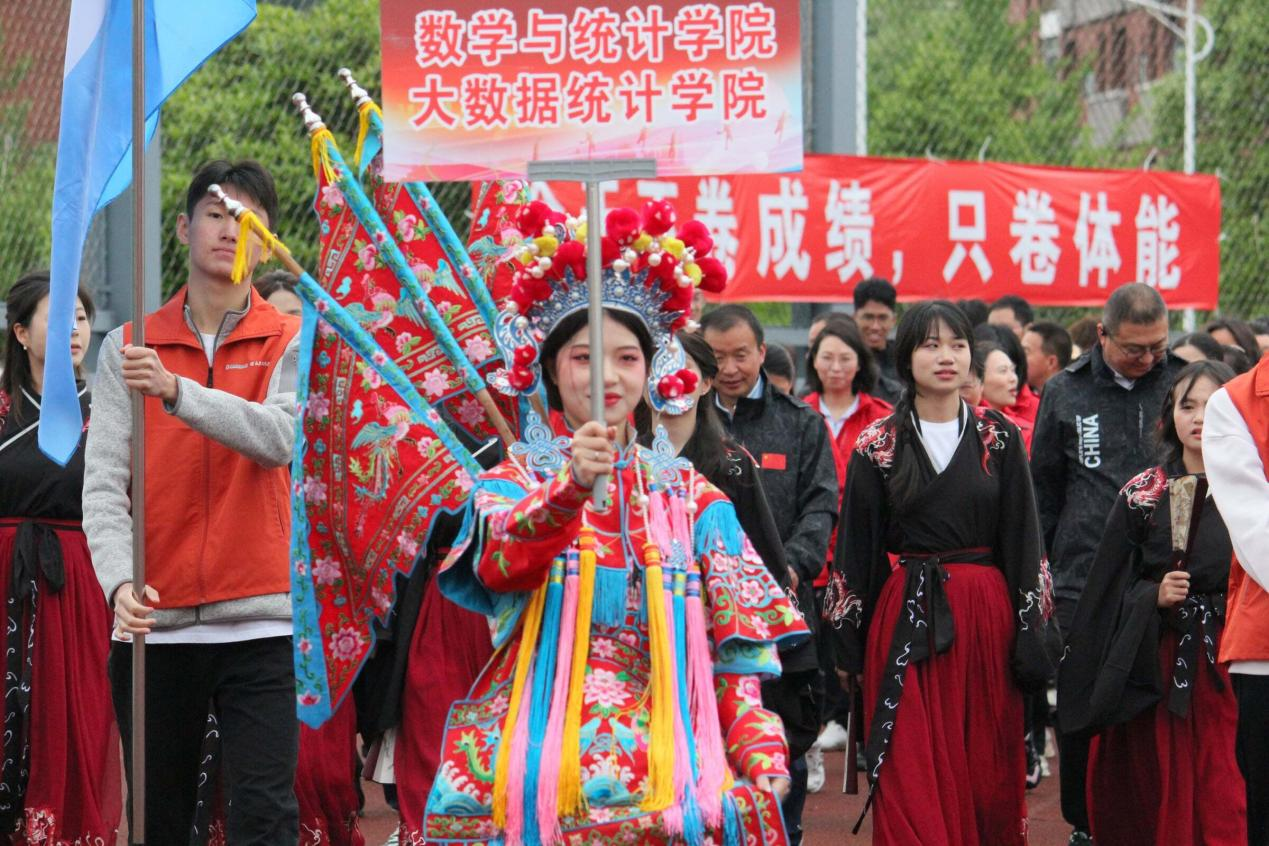 开幕式表演中,学院方阵以"数蕴国粹,理绽芳华"为主题,将人类非物质文化遗产——京剧艺术融入入场式设计。举牌同学身着京剧亮相,以传统戏曲之美诠释数统学子的多元风采。方阵将京剧脸谱元素融入,在传承非遗文化的同时,展现了学院"文理交融、守正创新"的精神风貌,赢得全场热烈掌声。