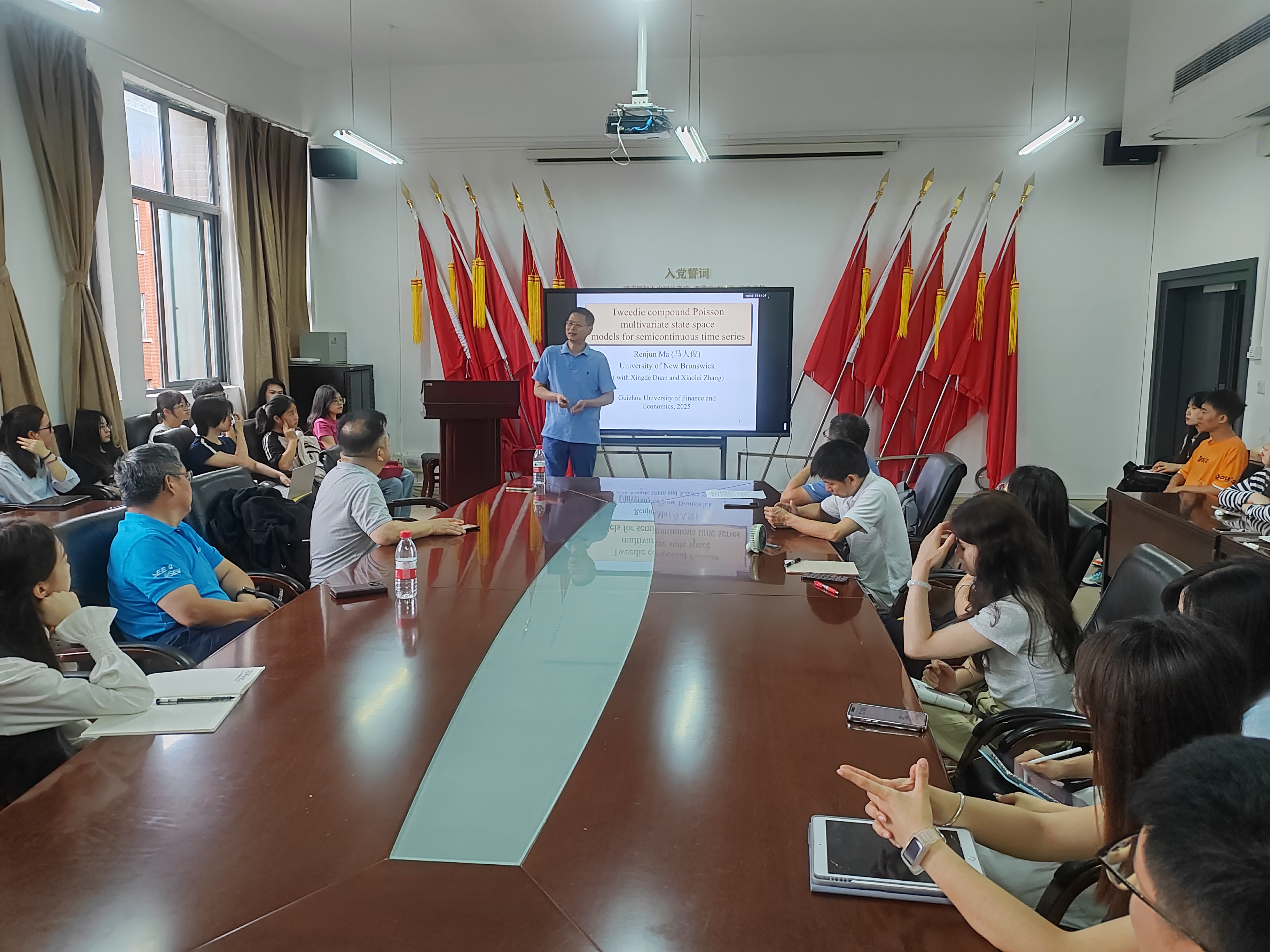 7月3日上午,老虎机游戏在线玩 举行“学术立校”暨“数统天地”论坛第100期讲座,加拿大新布伦瑞克大学马人俊教授应邀主讲,讲座由贵州省经济系统仿真重点实验室主任张文专主持。
