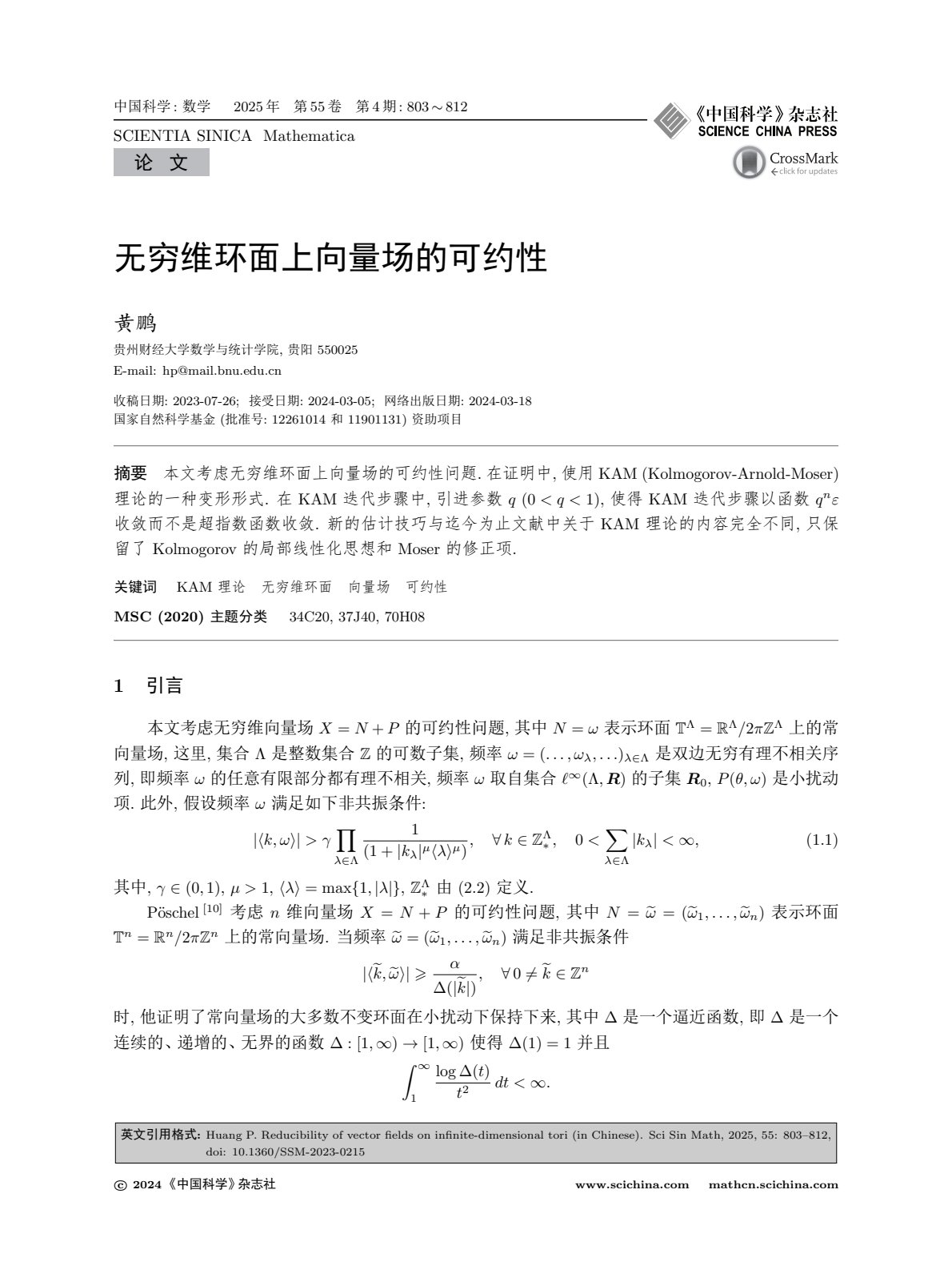 近日,老虎机游戏在线玩 黄鹏副教授以贵州财经大学为唯一通讯单位,在期刊《中国科学:数学》上发表了题为“无穷维环面上向量场的可约性”的研究论文。