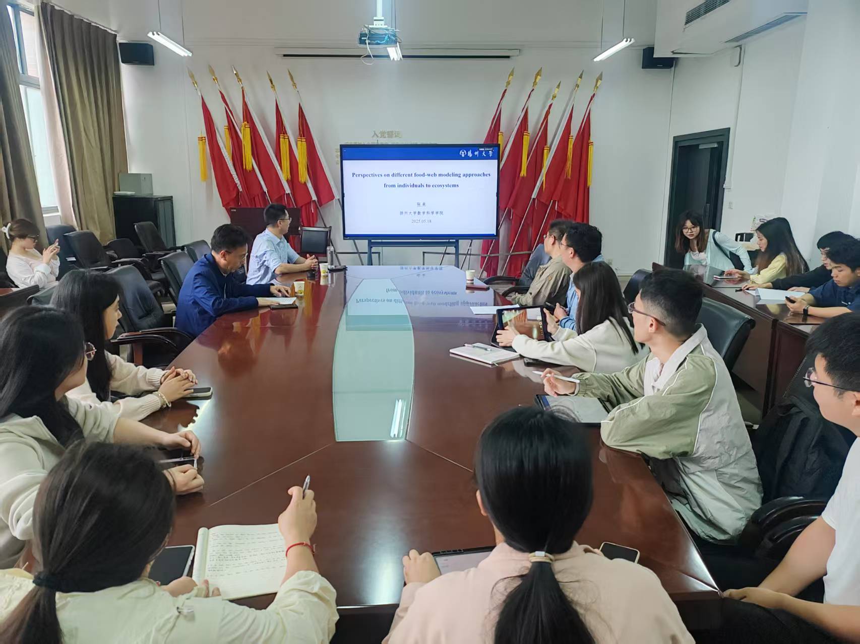 张来以“Perspectives on different food-web modelling approaches from individuals to ecosystems”为主题,简单介绍了水生生态系统,并对休渔期模型、具尺度结构的食物网模型、基于特征的食物网模型、粒径谱模型等几种食物网模型进行了详细的介绍。最后,张来教授结合案例分享了目前取得的最新成果。
