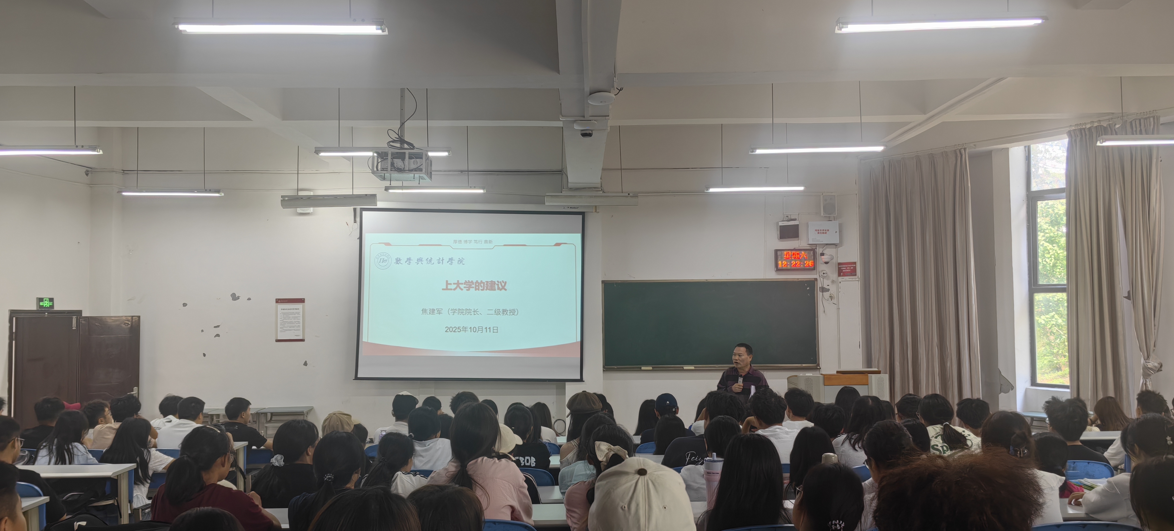 10月11日,老虎机游戏在线玩 院长焦建军教授在进学楼101报告厅为2025级全体本科生主讲“上大学的建议”主题讲座。“数”职未来班主任工作室负责人、2025级辅导员舒瑜主持讲座,近200名新生到场聆听。