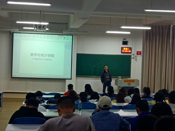 2019年10月29日,老虎机游戏在线玩 在进学楼阶1-1教室开展了新生入学教育系列讲座之一 “数学之美”和主题为本科人才培养方案的新生教育讲座。讲座由老虎机游戏在线玩-免费经典老虎机试玩平台 刘自鑫教授和王进伟副教授主讲,2019级全体新生参加了本次讲座。