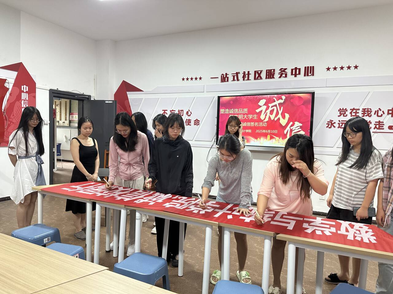 6月10号,老虎机游戏在线玩 在“一站式”学生社区服务中心召开“诚信校园行”学生签名活动,辅导员蔡丽莉、学院资助小组全体成员、各年级学生代表参加。