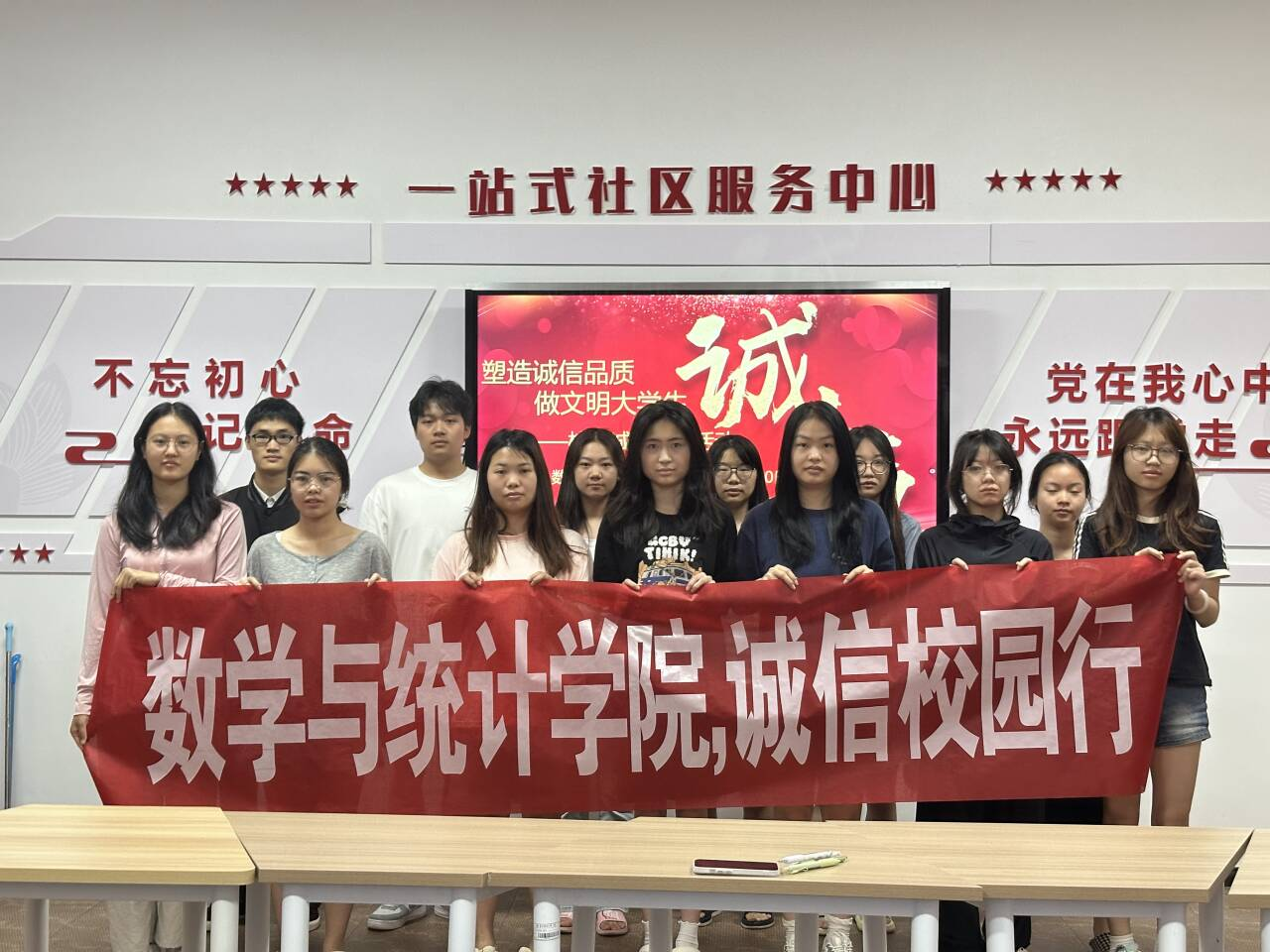 最后,同学们在“诚信校园行”标语的横幅上签名并合影留念,以实际行动承诺践行诚信。此次活动旨在强化大家对诚信的认知,有效营造了校园诚信文化氛围。