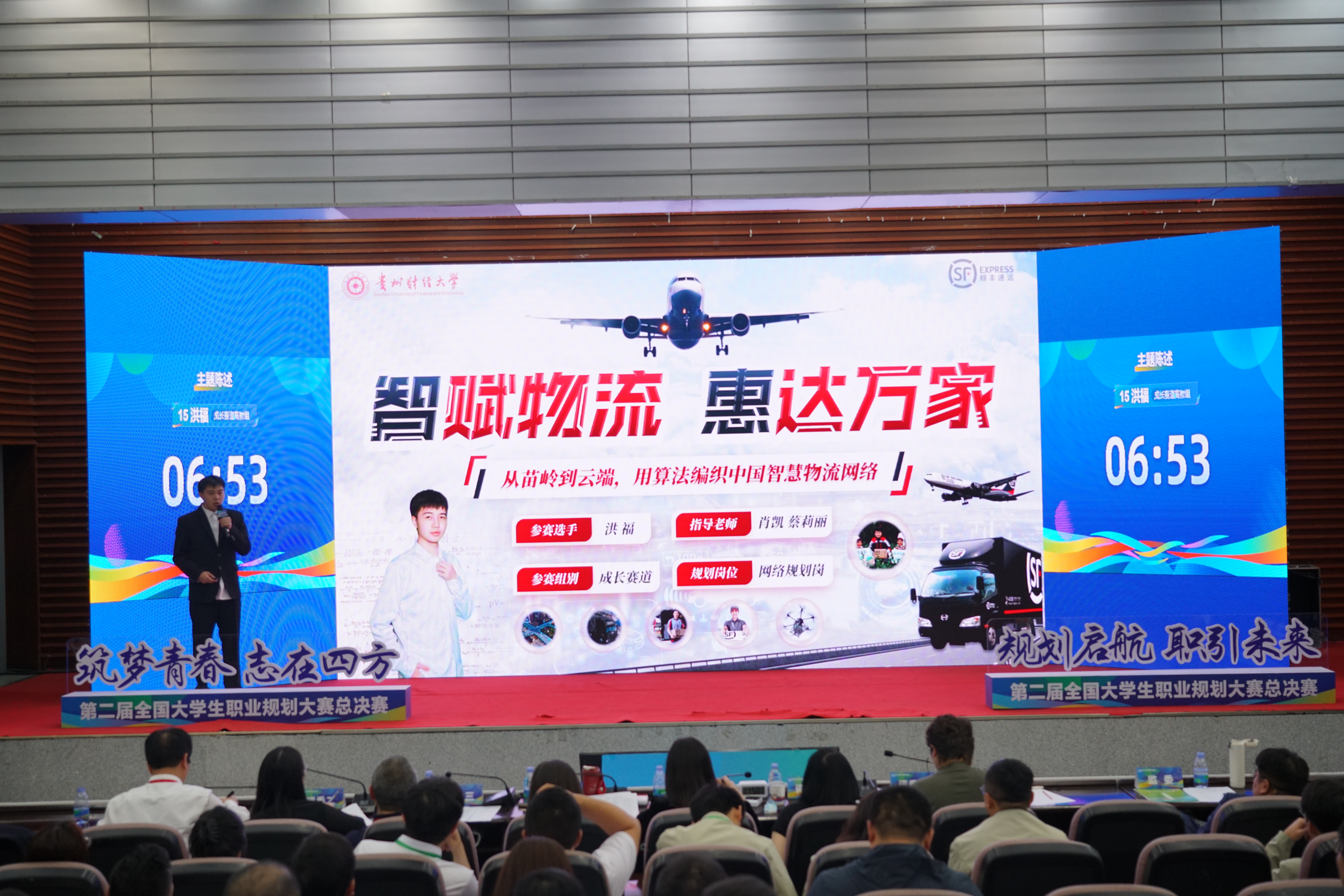 本次大赛设成长赛道和就业赛道,全国总决赛参赛选手共计约750人。其中,贵州省成长赛道选派5名学生参赛,洪福作为我校唯一代表晋级全国总决赛。比赛流程分为PPT汇报展示,7名专家轮流提问后选手回答,天降offer,专家打分和心选团代表评价等环节。