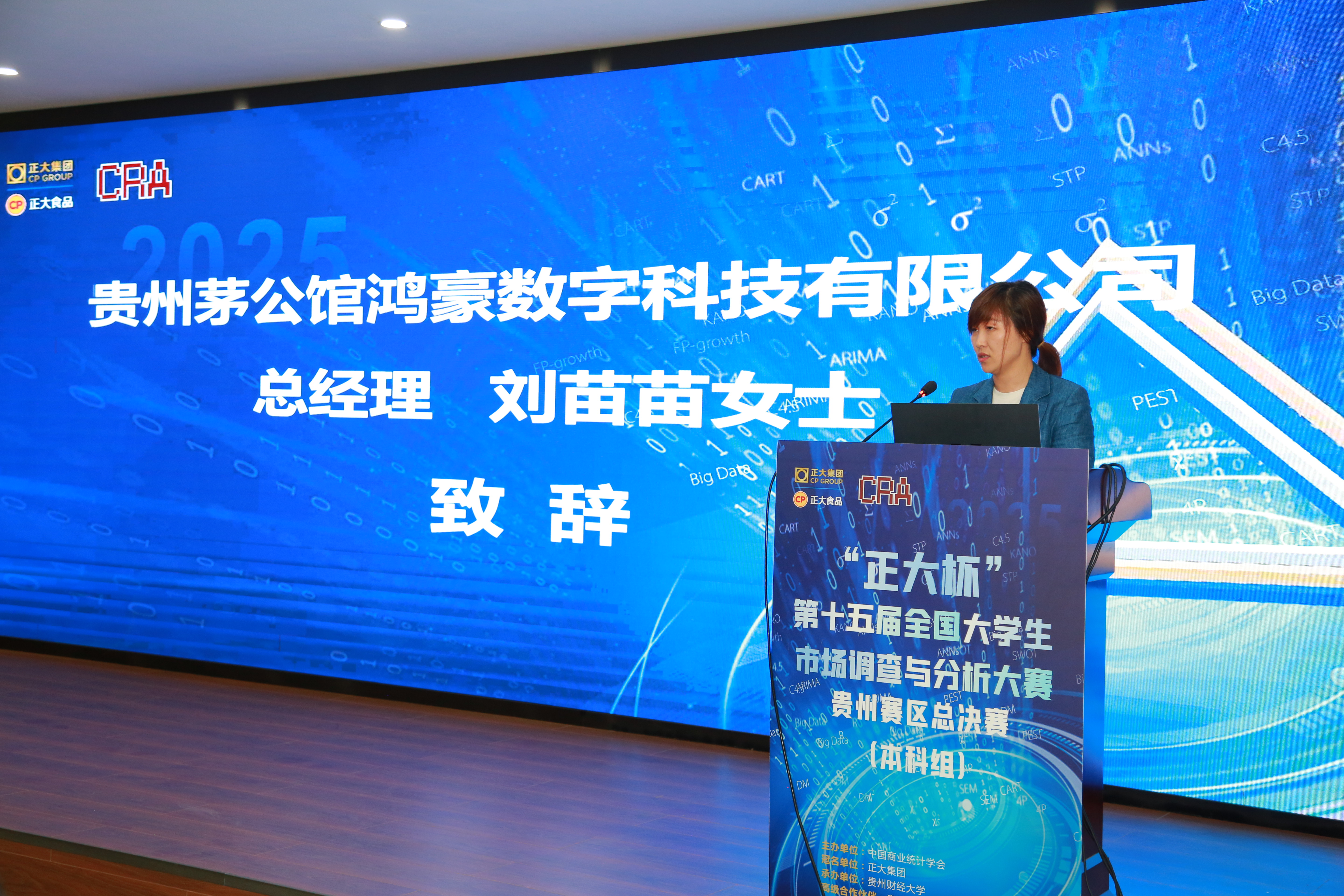 本届赛事高级合作伙伴单位、贵州茅公馆鸿豪数字科技有限公司总经理刘苗苗女士在致辞中表达了企业对人才的需求和对大赛的支持,希望通过大赛发现更多优秀的市场调查与分析人才。