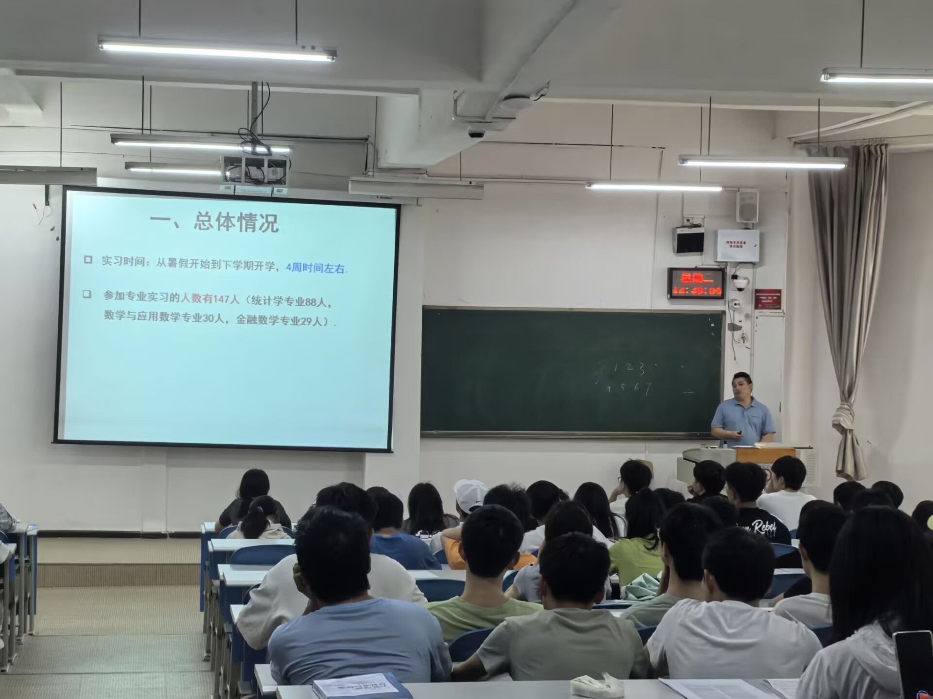 会上,应用数学系主任冯大河介绍了学院的专业实习工作方案。方案采用分散与集中相结合的方式,参加集中实习的学生到学院的签约实习基地实习,参加分散实习的学生自行联系实习单位。同学们可以根据自身实际情况,选择适合自己的实习方式。他强调了实习过程中需注意的安全事项,要求严格实习考勤纪律,确保实习活动顺利完成。