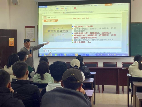 紧接着,焦建军强调考研的重要性,他号召同学们要做好自己的人生规划,脚踏实地去备战考研,只有努力才能带来收获。他从考研形势以及自身体会等多个方面为大家具体分析了考研的益处,让同学们理解了考研可以有更高的起点,更好的就业机会。同时介绍了学院及硕士研究生招生专业的情况,积极鼓励同学们报考本院的研究生。
