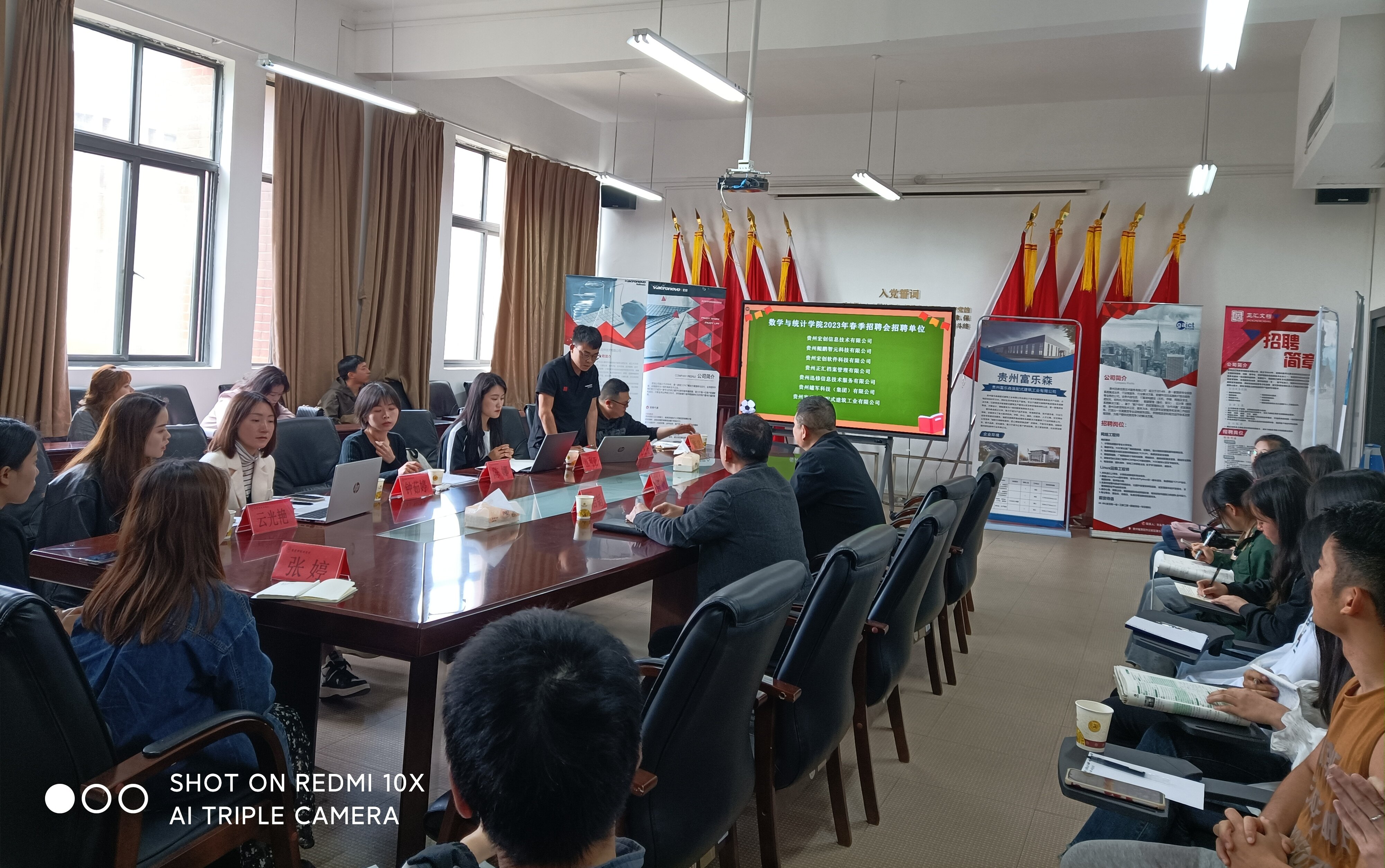 4月27日,老虎机游戏在线玩 在志学楼331会议室举办2023年春季第二场校园招聘会,邀请了贵州罐军科技(集团)有限公司、贵州富乐森装配式建筑工业有限公司、贵州宏创信息技术有限公司、贵州鲲鹏智元科技有限公司、贵州宏创软件科技有限公司、贵州正汇档案管理有限公司、贵州迅修信息技术服务有限公司等七家用人单位到场。学院党委书记虞帆、党委副书记朱吉韬以及2023届毕业生参加。
