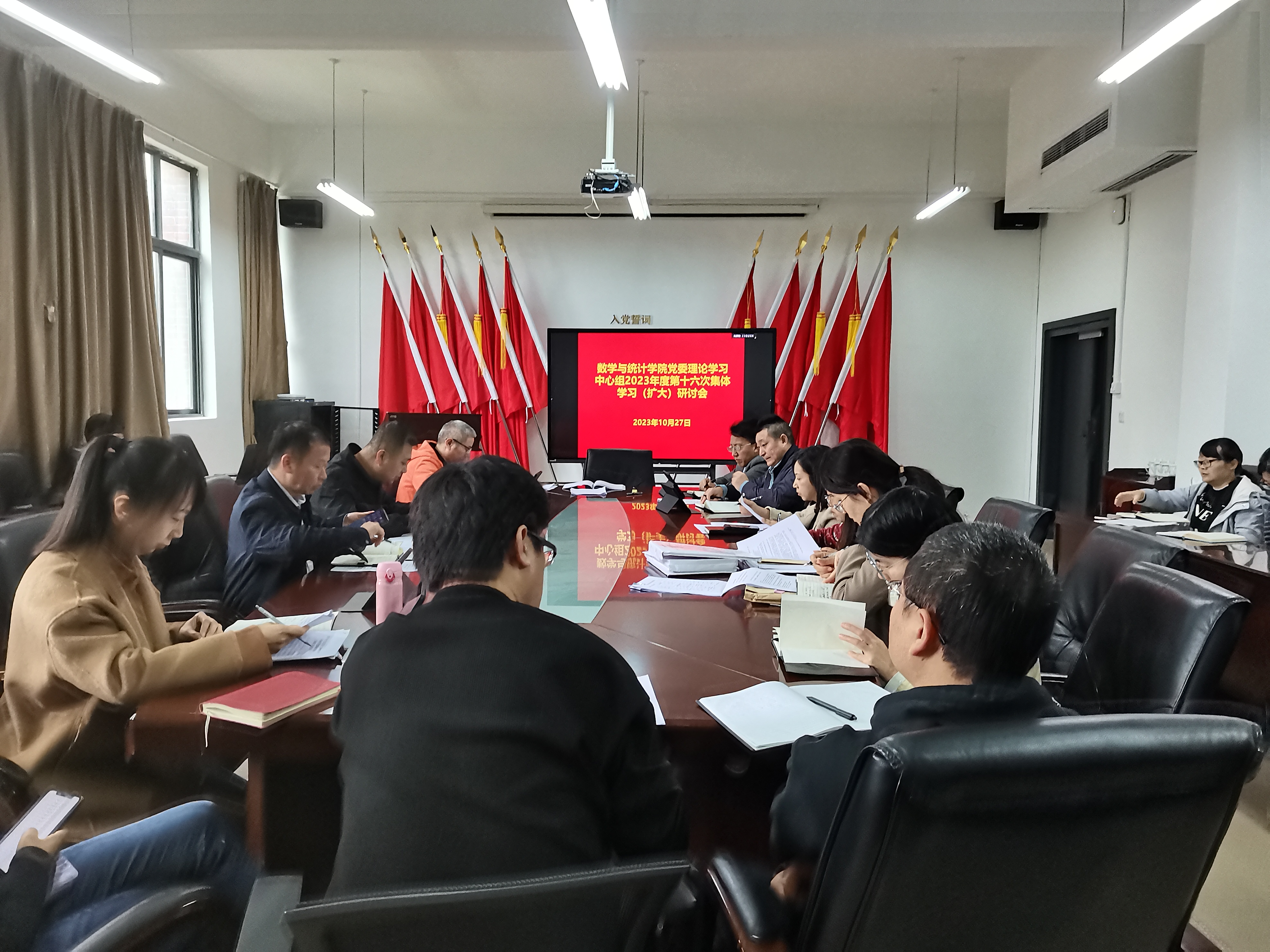 党委理论学习中心组在志学楼331会议室召开2023年度第十六次集体学习(扩大)研讨会,学院党政领导班子、各科室负责人、各系部主任参加,院党委书记虞帆主持会议。