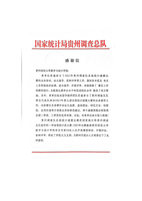 近日,我校老虎机游戏在线玩 收到国家统计局贵州调查总队的感谢信,来信对我校老虎机游戏在线玩 在2023年第九届全国统计建模大赛和2023年贵州调查队系统统计建模比赛中给予的帮助表示感谢。