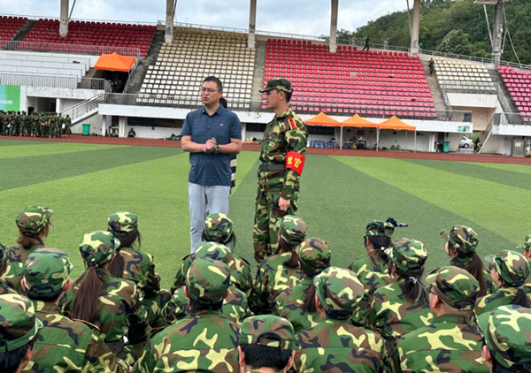 虞帆代表学院向参训的2022级同学致以亲切的问候,他称赞同学们能吃苦、肯训练,鼓励同学们再接再厉,严格训练,圆满完成军训任务。