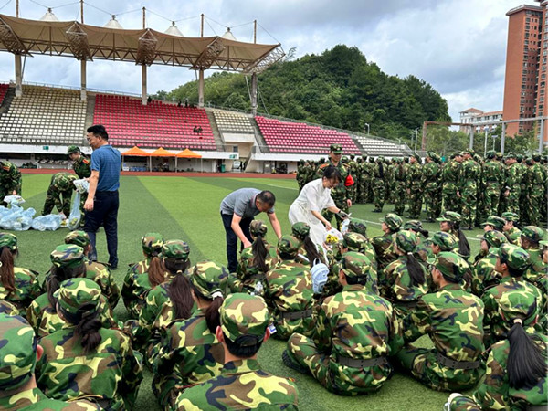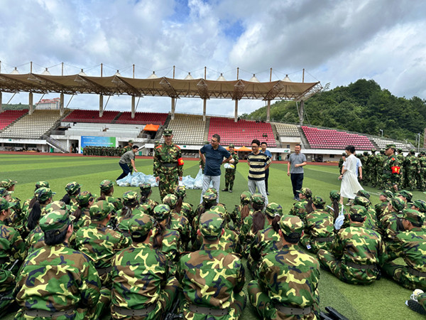 随后,领导们走到学生们中间为学生们送上了精心准备的慰问品。他们亲手将饮料和零食递到同学们手中,并叮嘱学生们要注意防暑降温,保持身体健康。