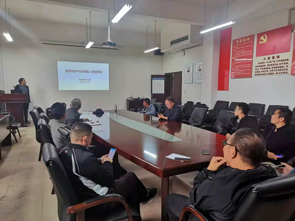 主讲人刘阳博士做了题为《数学教学中如何融入课程思政》的报告。他首先讲述了自己对课程思政的理解,认为课程思政是“三全育人”的具体体现形式,专业教育要与思想政治理论课同向同行,形成协同效应,达到“润物细无声”的育人效果。其次,以《数学分析》这门课为例,详细讲述了《数学分析》这门课融入课程思政的具体实施方法。与会教师就如何在专业教育中如何融合思政教育进行了探讨,分享了各自的做法和经验。