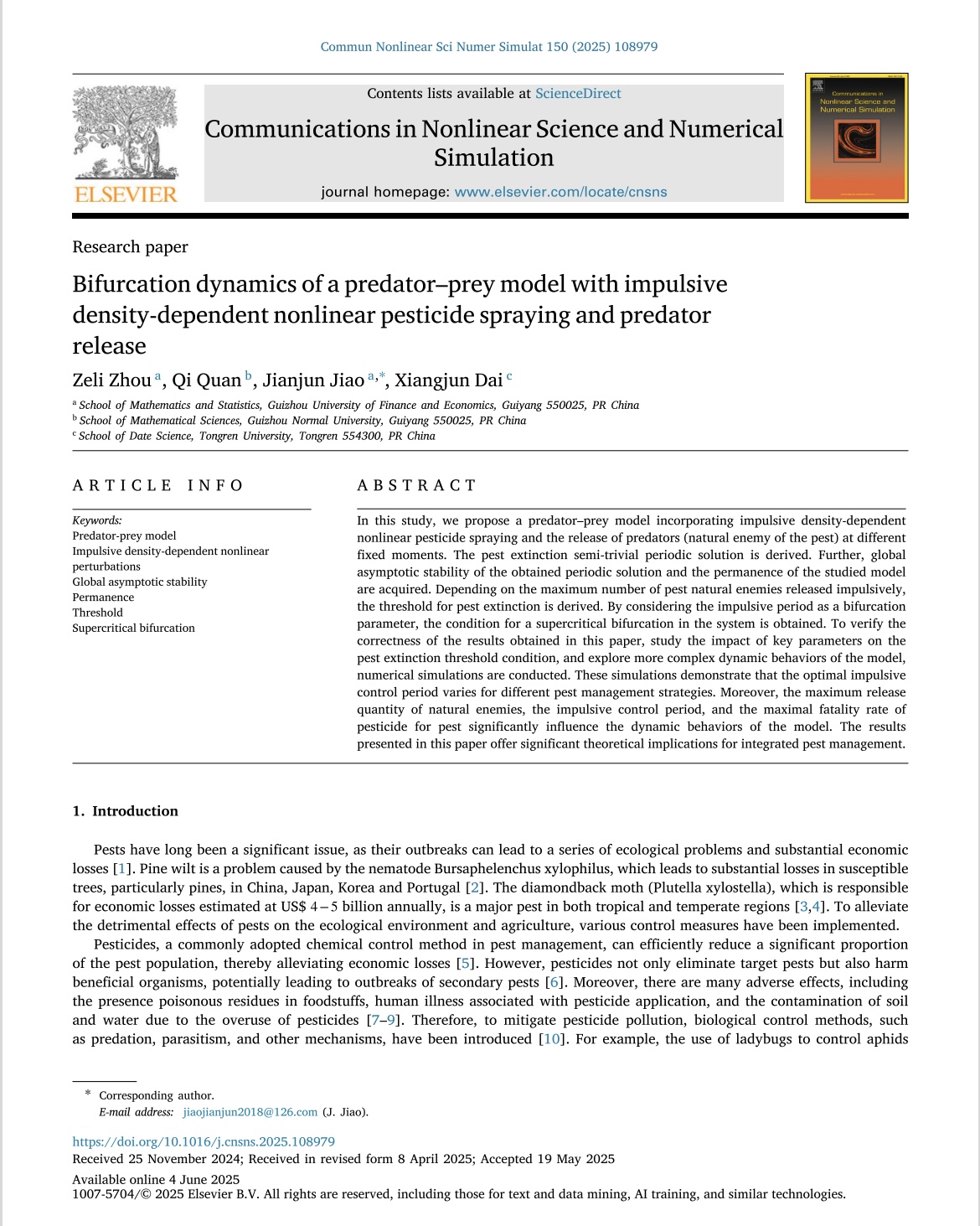 近日,老虎机游戏在线玩 2023级硕士生周泽丽同学以第一作者的身份在中国科学院二区期刊(JCR一区)Communications in Nonlinear Science and Numerical Simulation(SCI,IF=3.4)上发表题为《Bifurcation dynamics of a predator–prey model with impulsive density-dependent nonlinear pesticide spraying and predator release》的研究性论文。该论文是在导师焦建军教授的指导下完成的,他们提出了一种新的具有不同时刻脉冲密度依赖非线性农药喷洒以及捕食者(害虫的天敌)释放的捕食者-食饵模型。推导出了害虫灭绝的半平凡周期解。进一步获得了所获周期解的全局渐近稳定性以及所研究模型的持久性。根据脉冲释放害虫天敌的最大数量,推导出了害虫灭绝的阈值。通过考虑脉冲周期作为分岔参数,获得了系统中超临界分岔的条件。研究关键参数对害虫灭绝阈值条件的影响,并探索模型更为复杂的动力学行为。研究结论对综合害虫治理具有重要的理论意义。老虎机游戏在线玩 焦建军教授为通讯作者,贵州财经大学为第一完成单位。