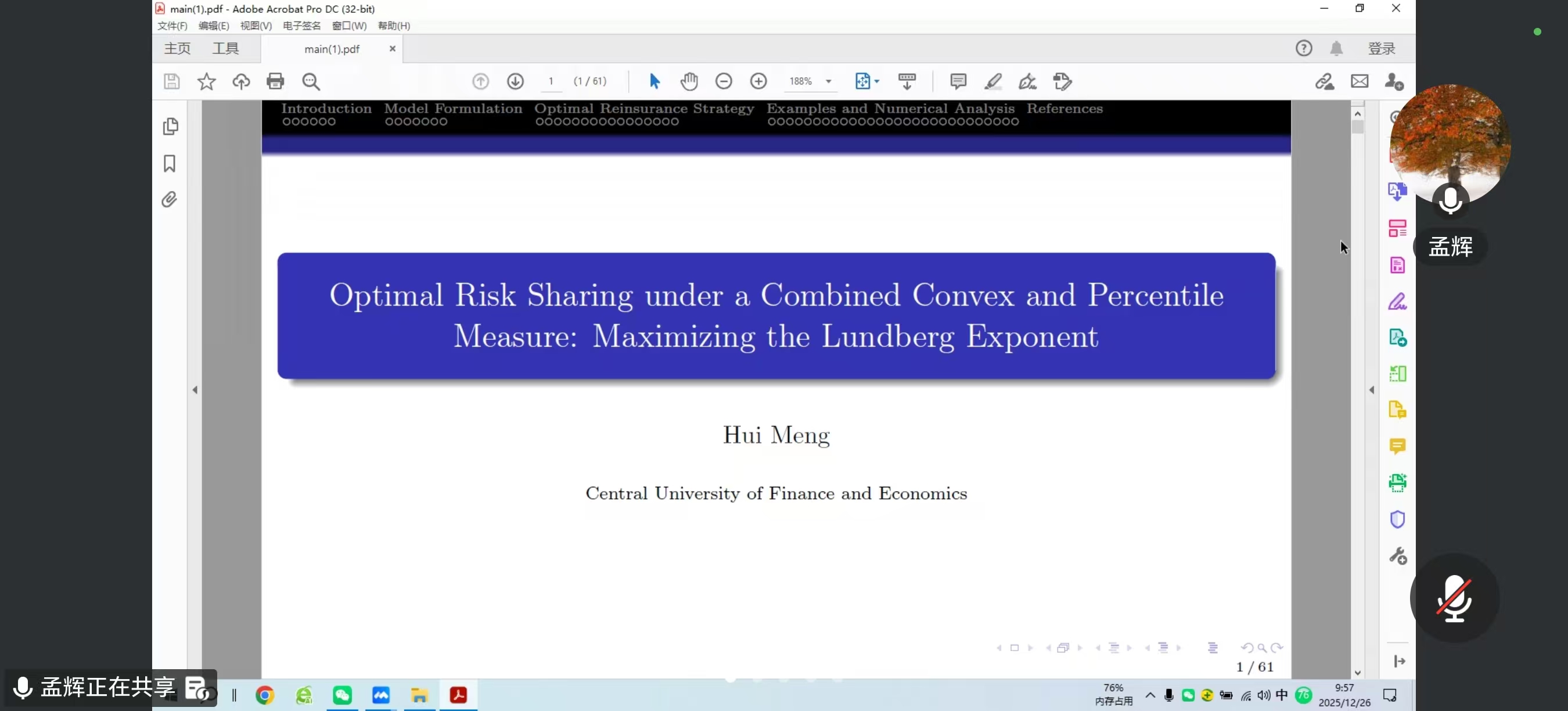 孟辉以“凸-分位数组合度量下的最优风险分担:最大化Lundberg 指数”为题,首先简单介绍了研究背景,指出最优再保险问题成为保险公司风险分担的关键,其核心在于控制再保成本的同时有效降低风险。其次,系统阐述了一类凸函数与分位数相结合的复合型保费准则,基于这种复合型保费准则以及Cramér–Lundberg 风险模型,在补偿原则和激励相容约束下,研究了具有再保险控制下的最大化Lundberg 指数。最后,基于凸优化下的调整方法,推导出了具有分段结构的最优再保险策略,以及证明了最优再保险策略和最大Lundberg 指数的存在性与唯一性。