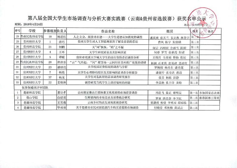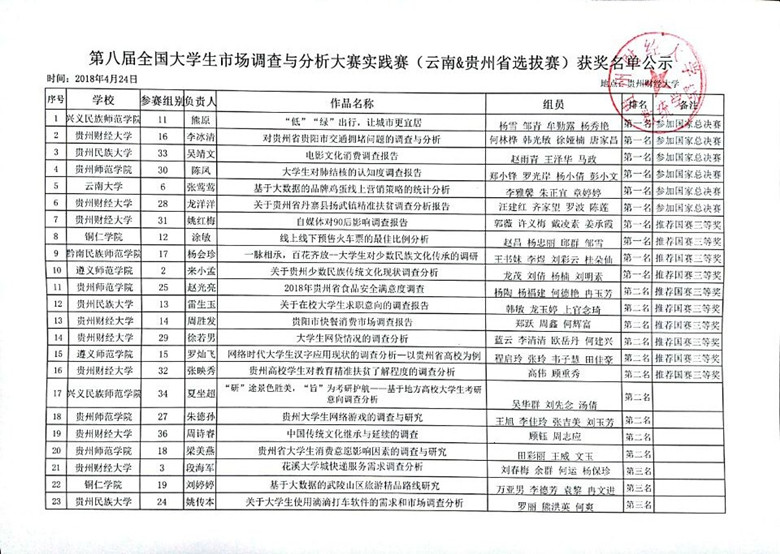第八届全国大学生市场调查与分析大赛实践赛(云南&贵州省选拔赛)获奖名单公示